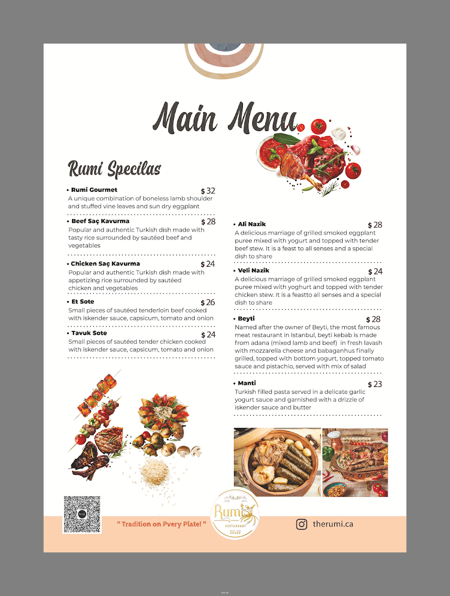 Welcome to Rumi Restaurant - York, a culinary gem nestled in the heart of York, Ontario. This vibrant eatery offers a rich tapestry of authentic Turkish flavors, making it a must-visit destination for food enthusiasts. Upon exploring the menu, you'll discover signature dishes that stand out, such as the Rumi Gourmet, featuring tender boneless lamb shoulder accompanied by stuffed vine leaves and sun-dried eggplant, all for CA$32.00.